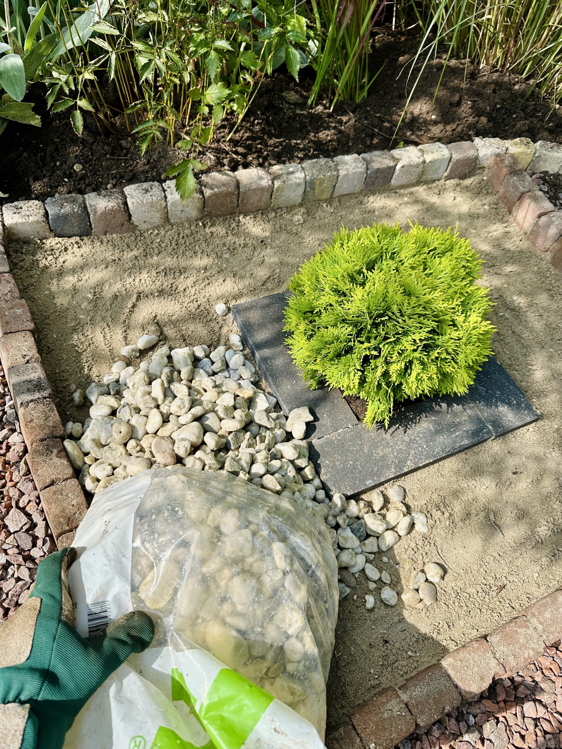 The initial vision is translated into the landscape through traced lines and temporary stone divisions. Proportion is tested directly on site, allowing space, movement, and scale to emerge before permanence is introduced.