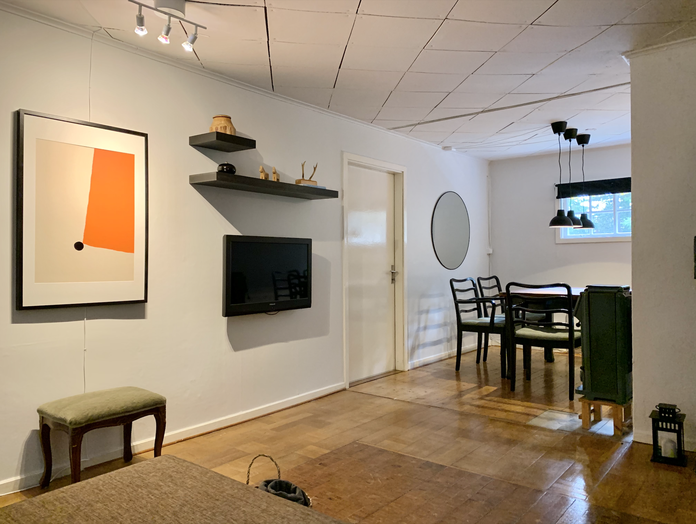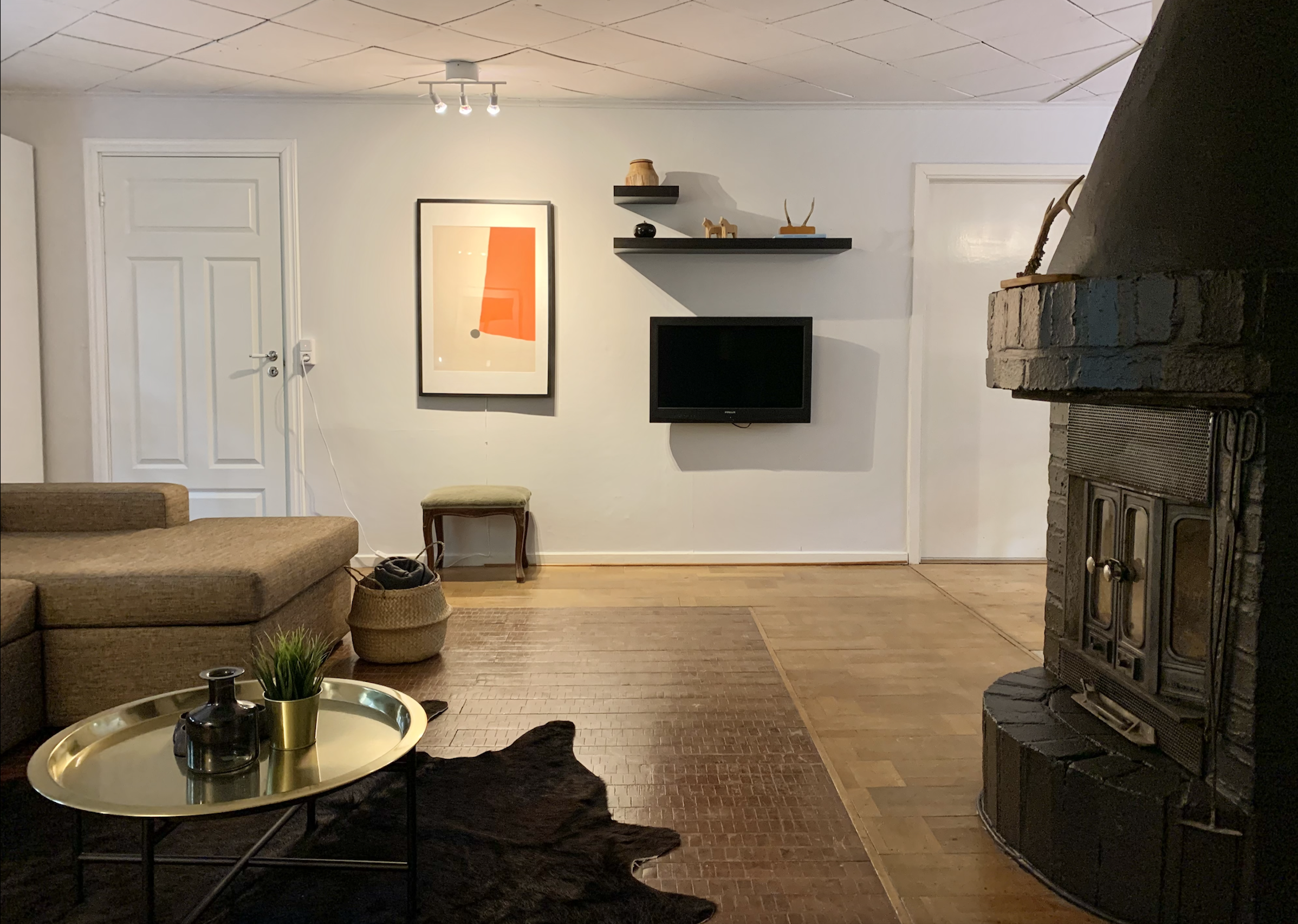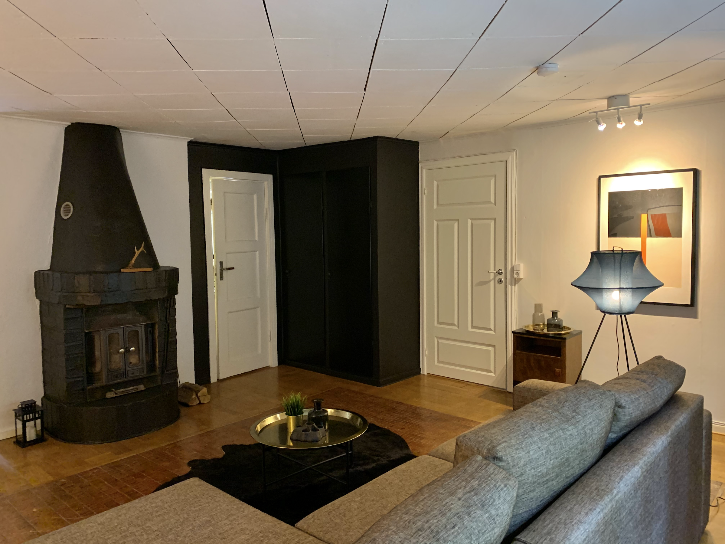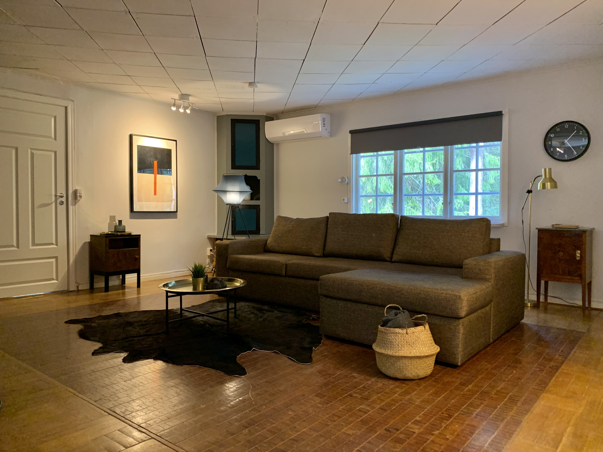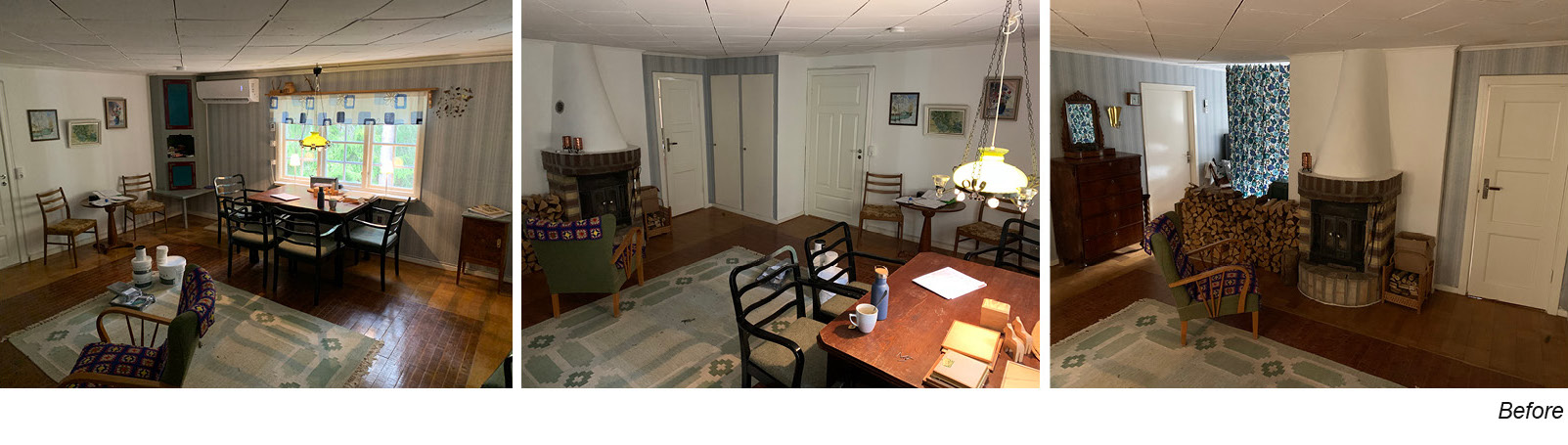 A living and dining space in Jönköping, Sweden, reimagined within a home embraced by forest and lakes landscape.