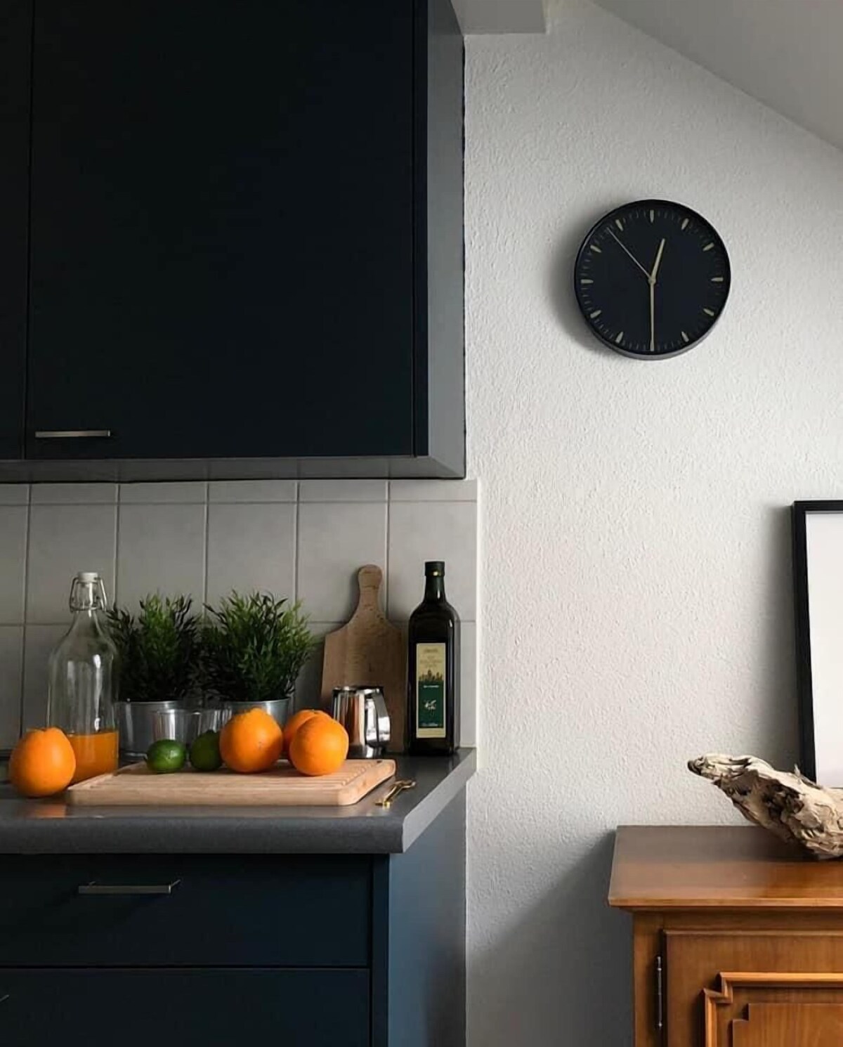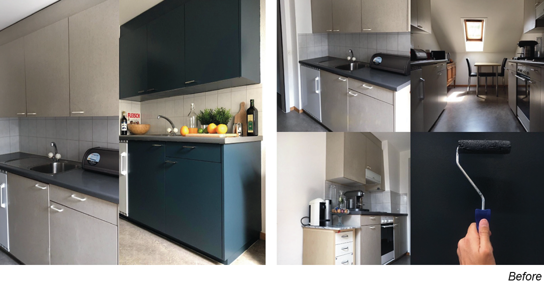 A small kitchen in Thun, Switzerland, transformed with bold blue cabinetry, preserved wood, and new hardware.